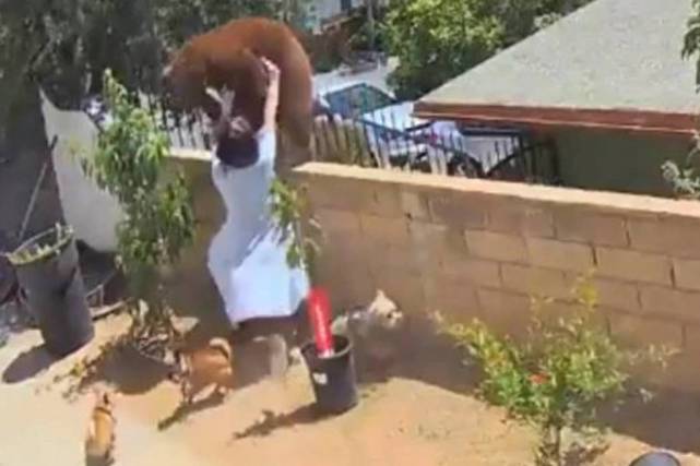 为了保护爱犬,海莉·莫里尼科不顾一切冲向棕熊,将其从院墙上推了下去。